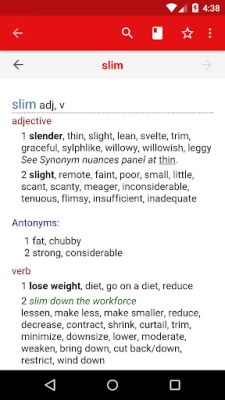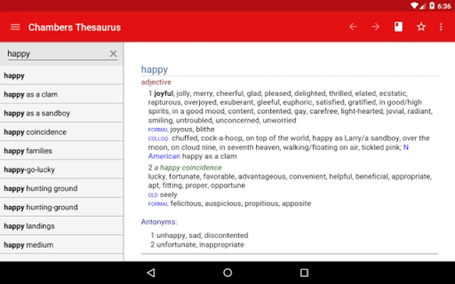 "The Chambers Thesaurus" va más allá de un simple repertorio de palabras, ofreciendo herramientas que enriquecen tu experiencia. Guarda tus términos favoritos con la función de marcadores, revisa tu historial de consultas recientes o explora al azar para descubrir joyas léxicas inesperadas. Lo mejor de todo es su total independencia: no requiere conexión a internet, lo que significa que tienes un universo de palabras siempre a tu alcance, estés donde estés. Y para una consulta aún más profunda, se integra a la perfección con "The Chambers Dictionary", permitiendo referencias cruzadas con facilidad y completando tu arsenal lingüístico con una precisión sin par.