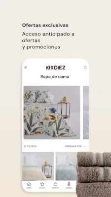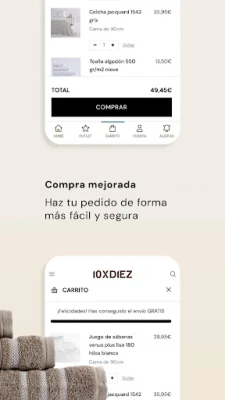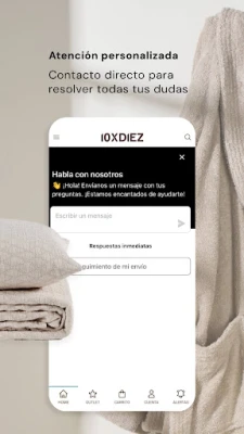 Con la app de diezxdiez, disfrutarás de ventajas pensadas para ti. Sé el primero en acceder a nuestras últimas tendencias y promociones especiales, diseñadas exclusivamente para nuestros usuarios. Gestiona tus preferencias y guarda tus productos favoritos para encontrarlos al instante. La adquisición de tus textiles es un proceso ágil, seguro y simplificado, con la comodidad de consultar el estado de tus pedidos y la posibilidad de resolver cualquier duda a través de nuestro servicio de atención al cliente integrado en la propia aplicación.