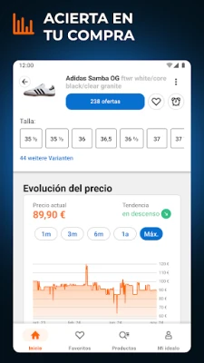 Navegar por el extenso catálogo de idealo es solo el inicio. Para asegurarte el precio ideal, activa nuestra alarma personalizada y recibirás notificaciones en el instante preciso en que el artículo deseado alcance tu objetivo. Guarda tus favoritos en una lista de deseos y monitorea diariamente la evolución de sus precios, para no perderte ninguna promoción. Además, con la función "Gangas", te revelamos una selección diaria de productos con las mayores caídas de precio, garantizando que nunca se te escape un descuento significativo en tus compras online. Un historial gráfico detallado te mostrará cómo fluctúan los precios, permitiéndote identificar el momento óptimo para realizar tu compra y aprovechar al máximo cada rebaja.